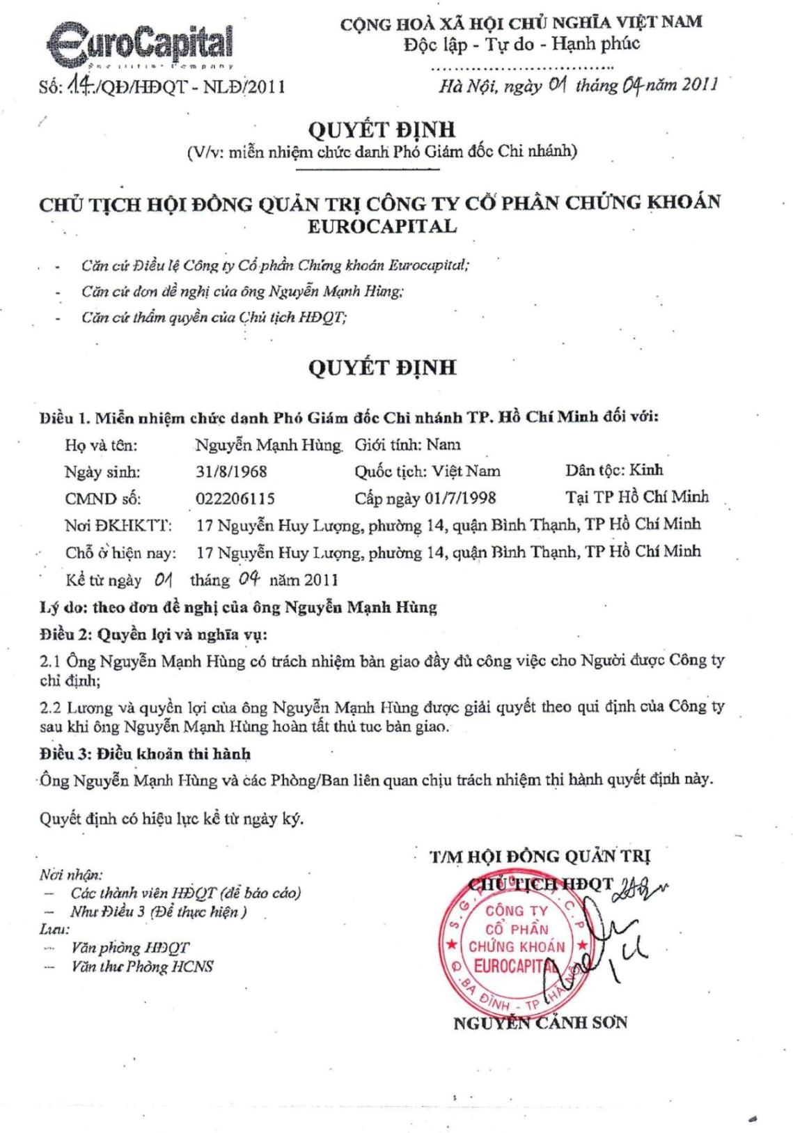 Bổ nhiệm lại Tổng Giám đốc Công ty Cổ phần Chứng khoán Eurocapital